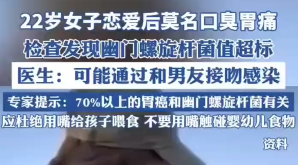 22岁女子恋爱后莫名口臭胃疼 检查发现幽门螺旋杆菌值超标